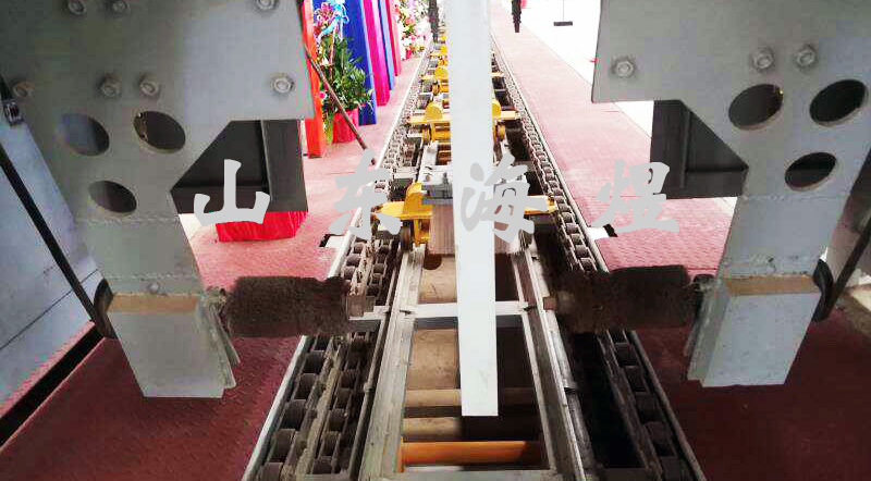 在管樁自動清模設(shè)備的固定座上設(shè)有可升降的機架,在固定座上設(shè)有能使機架提升或下降的升降傳動裝置,在機架下方上連接有多個可轉(zhuǎn)動的清模鋼刷輪,在機架上方設(shè)有驅(qū)動清模鋼刷輪轉(zhuǎn)運的清模電機,清模電機與清模鋼刷輪之間通過一傳動機構(gòu)相互連接。清模設(shè)備在清洗模具時,首先升降電機升起,讓管樁模具進入,然后升降電機下降,讓清模鋼刷輪進入接口板槽,再啟動清模電機,清模鋼刷輪高速旋轉(zhuǎn),然后開啟驅(qū)動電機使清模設(shè)備在軌道上前后水平移動逐步清理模具上的混凝土,達到清理模具的目的。